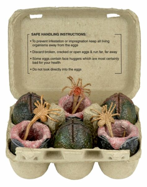 Set obsahuje 6 vetřelčích vajec a 3 facehuggery s ohebnými ocasy, vše zabaleno ve stylové krabičce. Figurka Ellen Ripleyové není součástí balení.